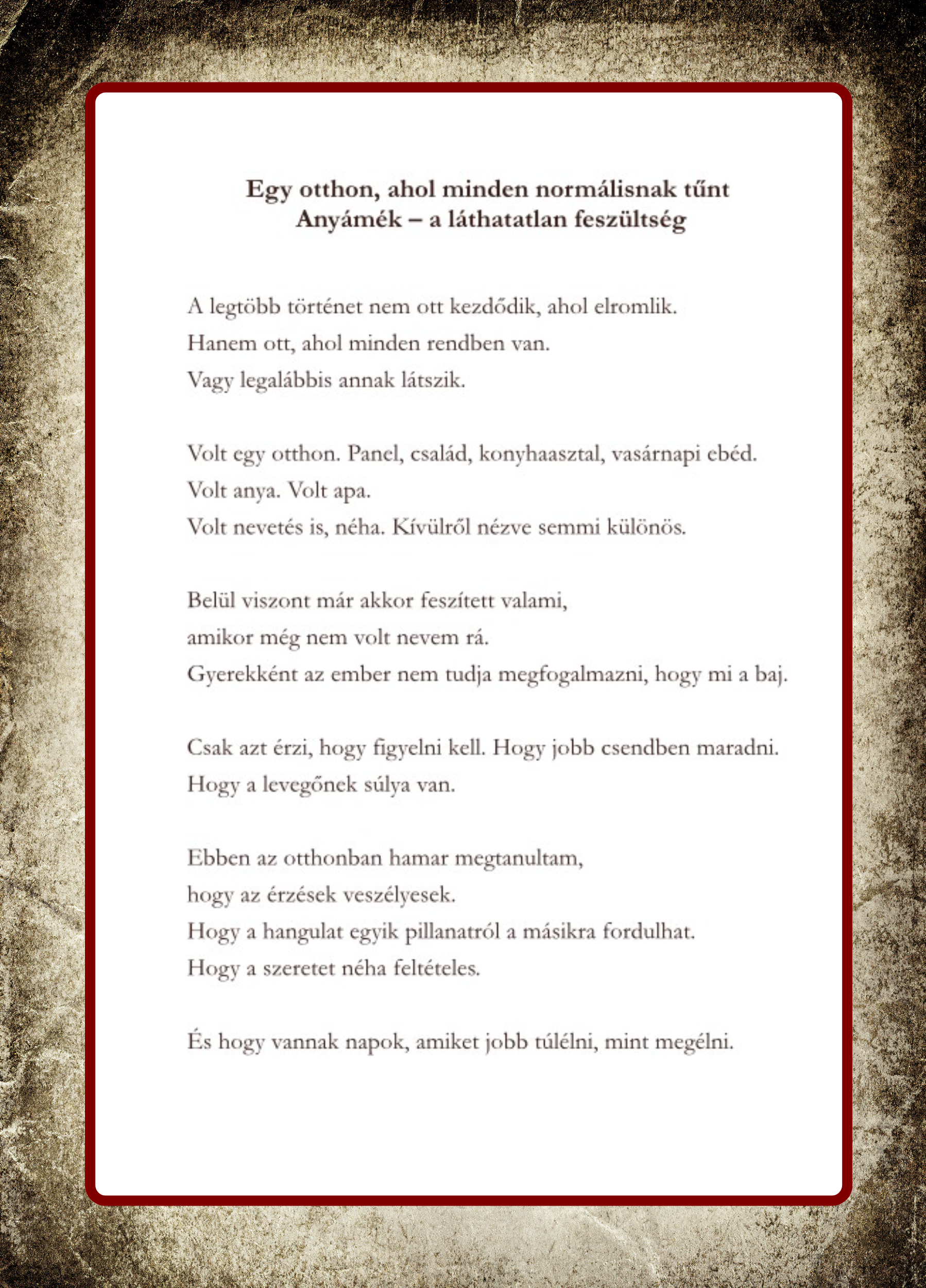 Ez a könyv nem tanítani akar. Nem akar megjavítani, és nem akar megmenteni. Ez a könyv csak megállít egy pillanatra. A KEGYELEM egy férfi története, aki egész életében erős volt. Működött. Megoldott. Kibírt. Nevetett, amikor kellett. Dolgozott, amikor kellett. Szeretett, amikor tudott. Kívülről minden rendben volt. Belül viszont lassan elfogyott. Nem maradt szerep. Nem maradt magyarázat. Nem maradt több erő. Csak egy utolsó ima. Nem szép. Nem felemelő. Inkább egy fuldokló mondat a sötétben. És egy csend, amelyben nem oldódott meg semmi. Csak megszűnt a menekülés. A KEGYELEM nem sikertörténet. Nem pozitív gondolkodás. Nem spirituális technika. Ez egy ember története arról, mi történik akkor, amikor már semmi nem működik. És mégis történik valami. Valami csendes. Valami megmagyarázhatatlan. Valami, amit talán csak így lehet nevezni: kegyelem. Amikor már nem te tartod az életed, hanem az élet tart téged. Ha elfáradtál a megoldásokban. Ha eleged van a tanácsokból. Ha nem jobb ember akarsz lenni, hanem végre igaz. Ez a könyv nem ígér semmit. De lehet, hogy nem tudod letenni. És amikor becsukod, lehet, hogy nem kapsz választ. Csak egy csendes felismerést. Hogy talán te sem vagy egyedül.