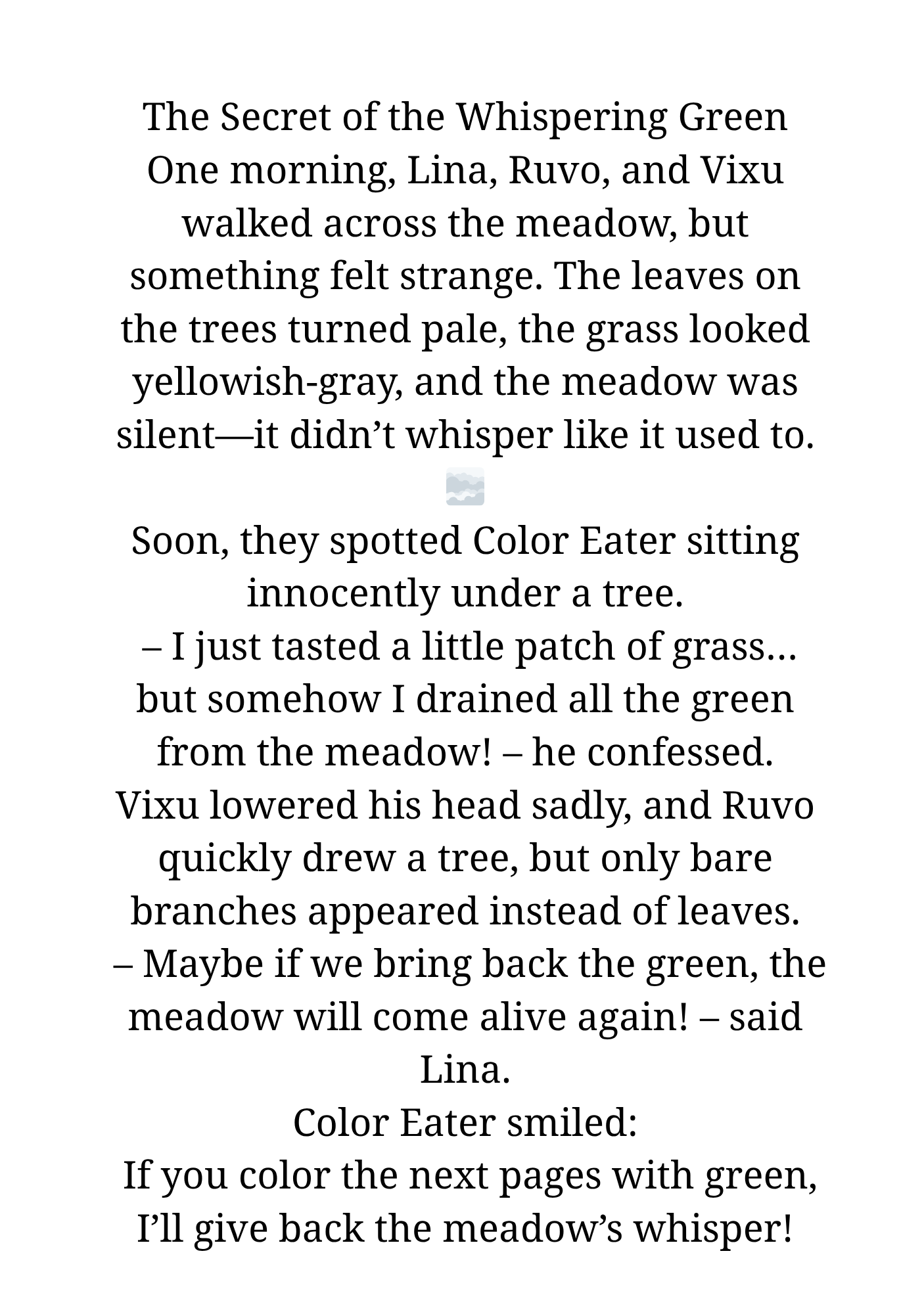 Let the color-saving adventure begin! Dive into a magical world where colors hold special powers, and three brave little heroes – Lina, Ruvo, and Vixu, the color-changing dragon – set off on a quest to stop the mischievous Color Eater, who is making the rainbow disappear one color at a time!